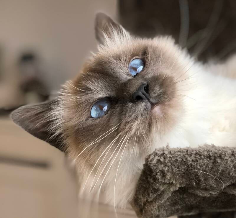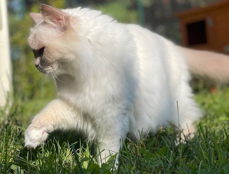 Il est resté craintif très longtemps car il a grandi dans un univers très tranquille : pas de bruit d’aspirateur, pas d’enfant, un seul humain à la maison.